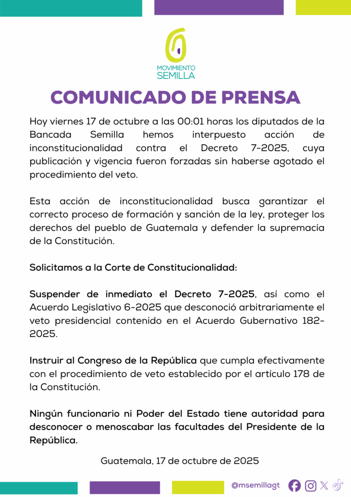 Este 17 de octubre de 2025, a través de un comunicado difundido en redes sociales, los diputados electos por el partido Movimiento Semilla informaron que presentaron una acción de inconstitucionalidad ante la Corte de Constitucionalidad en contra del Decreto 7-2025. Argumentan que la publicación y vigencia del mismo fueron “forzadas” sin haberse agotado el proceso de veto presidencial.
