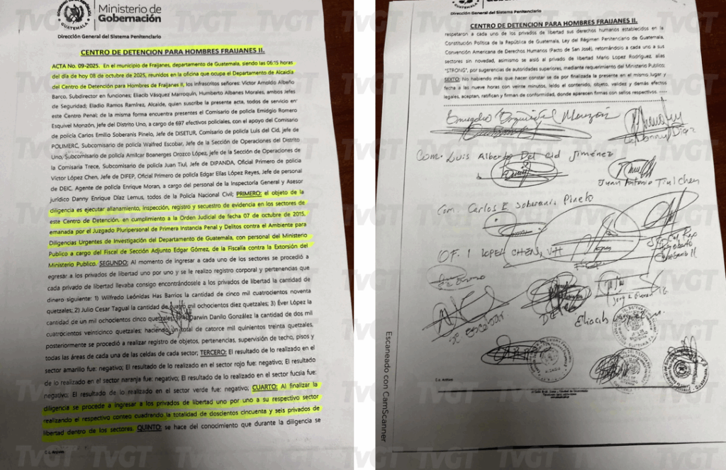 Documentos oficiales del Sistema Penitenciario (SP) confirman que el pasado 8 de octubre se realizaron requisas en la cárcel de máxima seguridad Fraijanes II. Estas diligencias, coordinadas con la Fiscalía contra el Delito de Extorsión del Ministerio Público, incluyeron revisión de internos y decomisos de dinero en efectivo. Las actas señalan que al concluir las requisas, los privados de libertad fueron reincorporados a sus sectores sin novedad alguna.