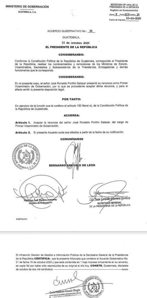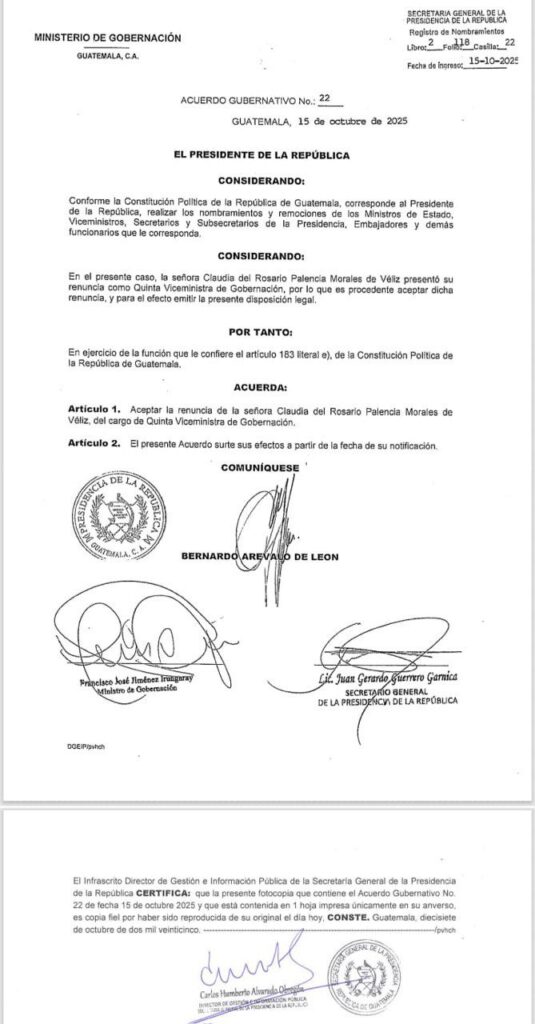 El manejo de la crisis en el Ministerio de Gobernación continúa generando tensiones. Mientras el Ejecutivo asegura que los viceministros siguen en funciones “hasta que se concrete el cambio de autoridades”, el diputado Allan Rodríguez, de la bancada VAMOS, publicó documentos oficiales que confirman la aceptación de las renuncias de Claudia Palencia y José Portillo, dejando en evidencia contradicciones y falta de transparencia en la administración de Bernardo Arévalo.